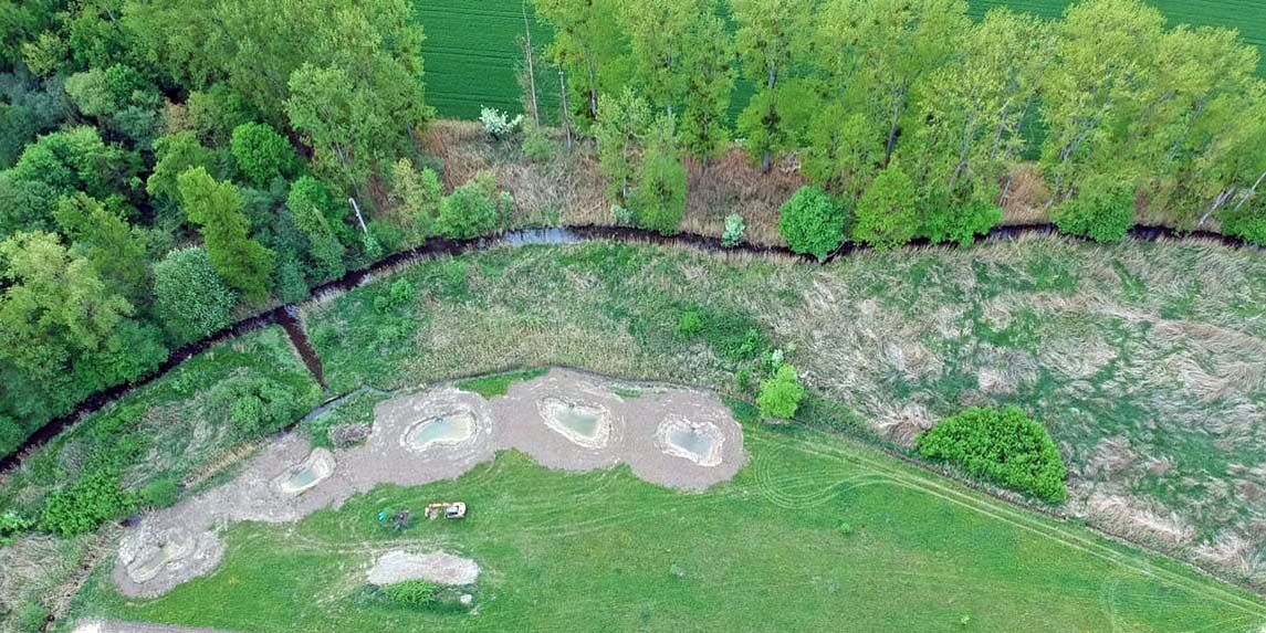 Die fünf hier im Frühjahr 2018 künstlich angelegten Tümpel sollen den Gelbbauchunken und einigen weiteren Amphibien einen Laichplatz sowie dauerhaften Lebensraum bieten.