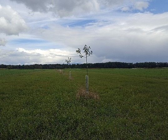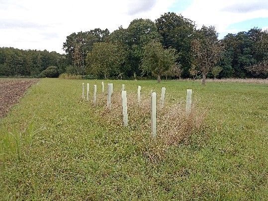 Dieses Jahr haben wir auf einer knapp 25 Ar großen Fläche nördlich von Bodersweier eine neue Streuobstwiese angelegt. Nachdem sich im Vorjahr eine schöne Grasnarbe auf der ehemaligen Ackerfläche gebildet hatte, war es nun an der Zeit, Bäume und Sträucher zu Pflanzen. Sieben hochstämmige Obstbäume, darunter eine Mostbirne und verschiedene alte Apfel- und Zwetschgensorten wurden in einer Reihe gepflanzt. Ergänzt wurde die Baumreihe durch ca. 20 Heckensträucher, die später einen wichtigen Lebensraum zwischen den sonst kargen Äckern im Umland bieten sollen.