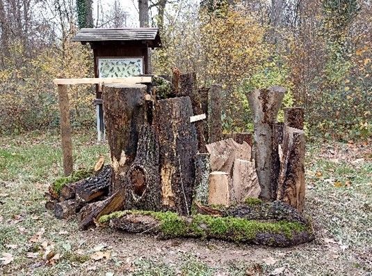 Dieses Jahr haben wir uns zum ersten Mal an den Bau einer Käferburg gewagt. Eine Käferburg ist eine von Menschen errichtete Ansammlung von Totholz, um eine Brut- und Überwinterungsstätte für totholz-bewohnende Insekten zu schaffen. Für unsere Käferburg haben wir Holz heimischer Bäume wie z.B. Eiche, Esche, Ahorn und Apfelbaum verwendet. Wichtig ist, Holzstücke in verschiedenen Durchmesserstärken anzubieten, sowohl liegend gestapelt als auch stehend im Erdreich eingegraben. Bodennahe Holzstücke haben eine höhere Feuchtigkeit und vermodern schneller, als stehende, der Sonne ausgesetzte Stammstücke, die gerade im Sommer eher trocken und warm sind. So können sich die verschiedenen Insektenarten das beste Plätzchen entsprechend ihrer Vorlieben aussuchen, um ihre Eier abzulegen. Die Zwischenräume wurden mit Sägespänen aufgefüllt. Diese verrotten schneller als intaktes Holz und sorgen schon bald für ein Angebot an Mulm, in dem sich die Larven vieler Käferarten gut entwickeln können.