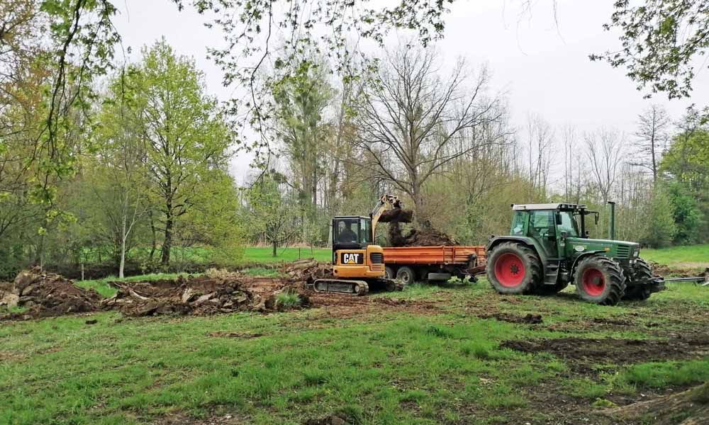 Doch im Herbst 2018 brauchte es für solch schöne Empfindungen noch viel Fantasie. Das Grundstück war dem damaligen Eigentümer durch einen tragischen Umstand entzogen worden und in einem fürchterlichen Zustand. So mussten erst einmal drei Holzhütten mit Fundament, ein Zelt, zwei Wohnwagen, ein KFZ-Anhänger, ein Container Metallschrott, 38 100-Liter-Säcke Restmüll, ein Anhänger Bauschutt, Sondermüll in Form von 20 Eternitplatten, drei Säcke Glas sowie ca. 120 Meter Maschendrahtzaun in über 70 Arbeitsstunden durch die Naturlandstiftung Baden entsorgt werden. Nach dieser Aufräumaktion der besonderen Art konnte das Gelände per Bagger wieder eingeebnet und zusätzlich eine Flachwasserzone neben dem Bachlauf angelegt werden. Noch sind nicht alle Wunden geschlossen , die dieses kleine Stück Land hat aushalten müssen, aber nun kann die Zeit sie heilen. Auch bemüht sich die Naturlandstiftung Baden augenblicklich, das angrenzende Flurstück wieder in eine Wiese verwandeln zu dürfen, da das Pflügen bis fast an den Stamm den Eichen sicher nicht gut tut. Auf dem Flurstück ist mittlerweile der mögliche maximale Schutzstatus für die drei Eichen erreicht. Zum einen durch das Einbringen in das Stiftungseigentum, zum anderen durch ihre Initiative, das Gelände als Naturdenkmal deklarieren zu lassen.
